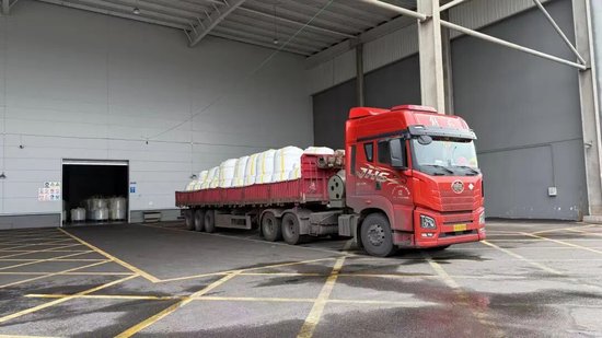 在装载区,多辆大卡车正在等待装货,其中一辆红色解放牌大挂车已装满白色袋装正极材料。现场工作人员介绍,每袋重量达1吨,每车一共30袋,共计30吨。
