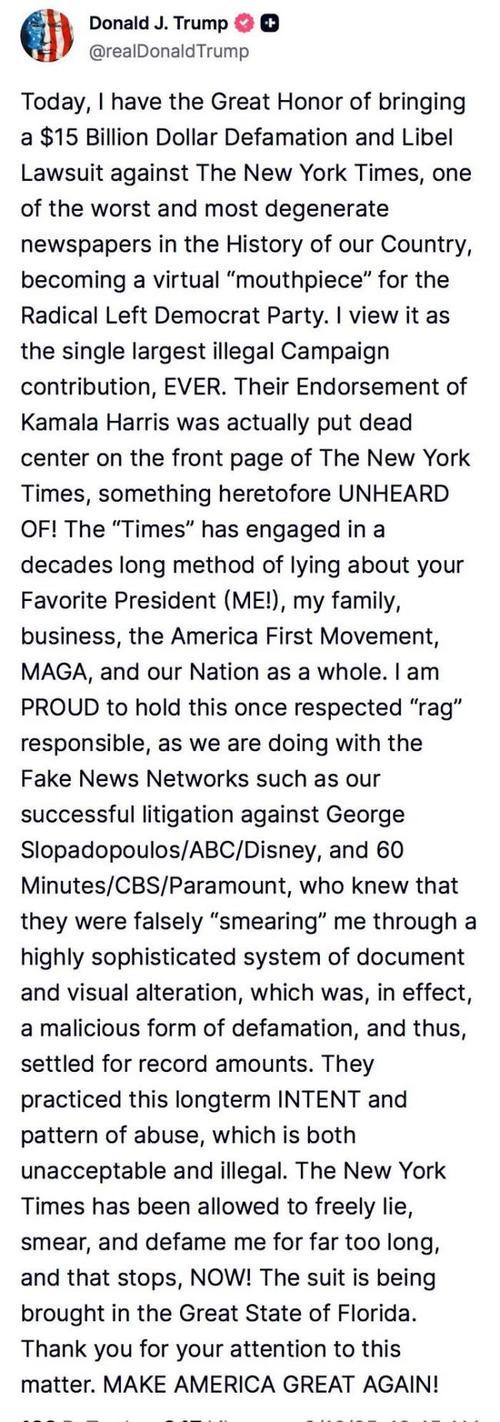 第二份则于2024年夏天提出,指控联邦调查局在2022年搜查其位于佛罗里达州的海湖庄园时侵犯了他的隐私权,并指称司法部在他离任后对其“处理机密文件不当”的起诉属于恶意起诉。索赔文件中写道:“这一恶意起诉迫使特朗普总统花费数千万美元来为案件和其声誉辩护。”