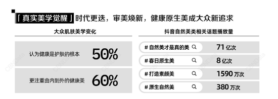 《2025抖音电商护肤趋势报告》显示,50%的受访者认为“健康是护肤的根本”,60%的受访者表示“更注重由内到外的健康美”。抖音平台上#自然美才是真的美 话题播放量高达71亿次。