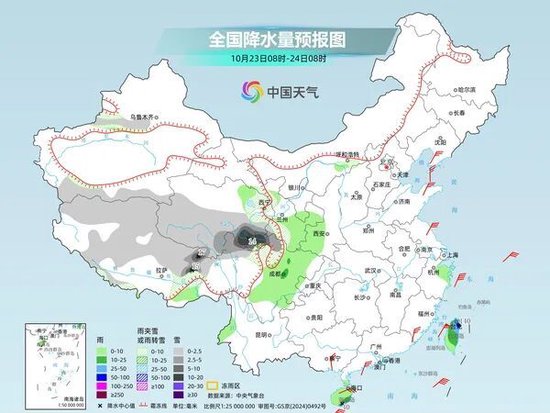 海南、台湾等地需注意防范强降雨可能引发的次生灾害。23日起,青藏高原等地雨雪增强,驾车需注意交通安全,出行防滑。