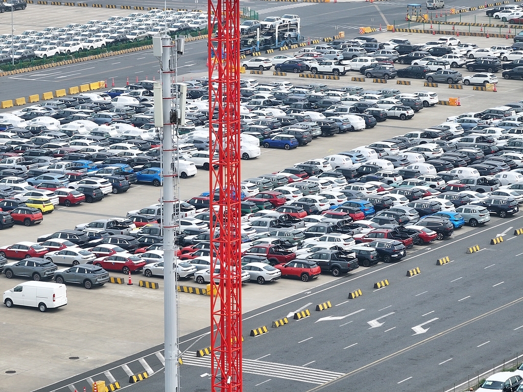 2025年10月3日,上海,外高桥海通国际汽车码头,一辆辆国产新能源汽车依次驶入滚装船。视觉中国 资料图