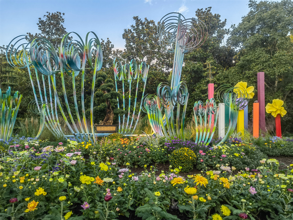 室外景点展区位于原花艺馆区域,将依托自然森林背景,布置7组室外景点。景点以菊花为主要造型材料,采用竹构、藤编等生态工艺,打造形态多样、意蕴丰富的菊花景观。