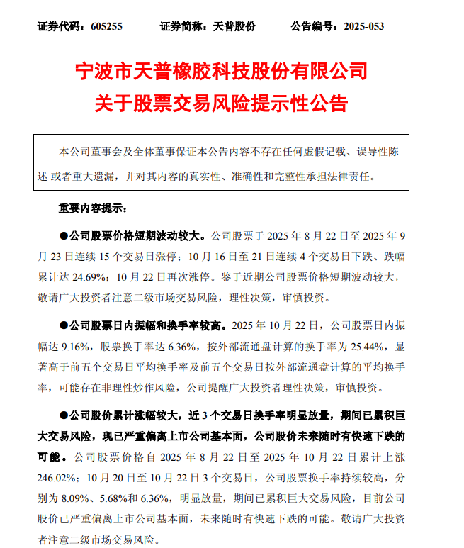 10月22日,(605255.SH)公告称,公司股票价格短期波动较大,自8月22日至10月22日累计上涨246.02%。近3个交易日换手率明显放量,期间已累积巨大交易风险,目前公司股价已严重偏离上市公司基本面,未来随时有快速下跌的可能。收购方中昊芯英自身现有资本证券化路径与本次收购上市公司无关。未来36个月内,收购方中昊芯英不存在通过上市公司借壳上市的计划或安排。公司股票交易多次触及股票交易异常波动、严重异常波动情形,部分投资者存在影响市场正常交易秩序、误导投资者交易决策的异常交易行为。