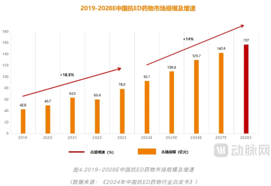 不不不!据《2024年中国抗ED药物行业白皮书》显示,2019-2023年,中国抗ED药物行业规模年复合增长率约为16.5%,预计2024-2028年将从93.1亿元进一步增长至157亿元,又一个百亿赛道即将呼之欲出。