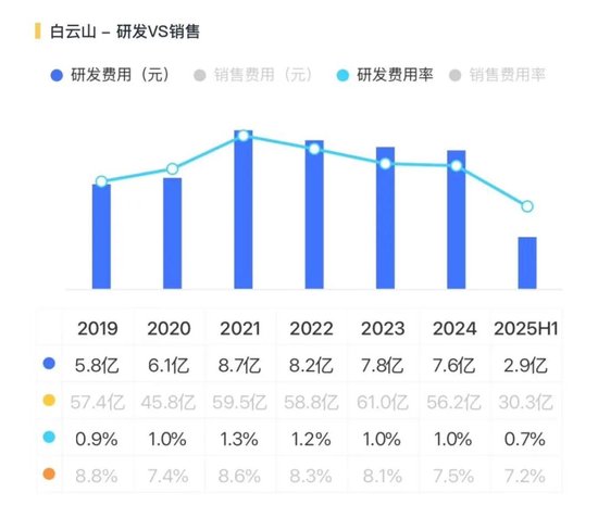 但与这一行业趋势形成反差的是,白云山并未对自家的研发“上强度”,今年上半年,研发费用化金额2.9亿,占营收比重仅为0.7%。