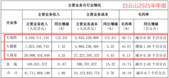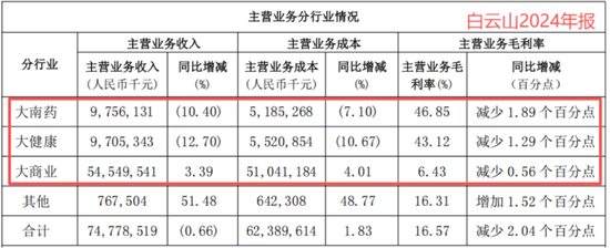 2024年以来,白云山的“三驾马车”中,大南药与大健康板块双双表现疲软。唯有利润微薄的大商业板块营收保持增长。然而,该板块增速不高且利润率低,难以扭转公司整体的盈利困境。