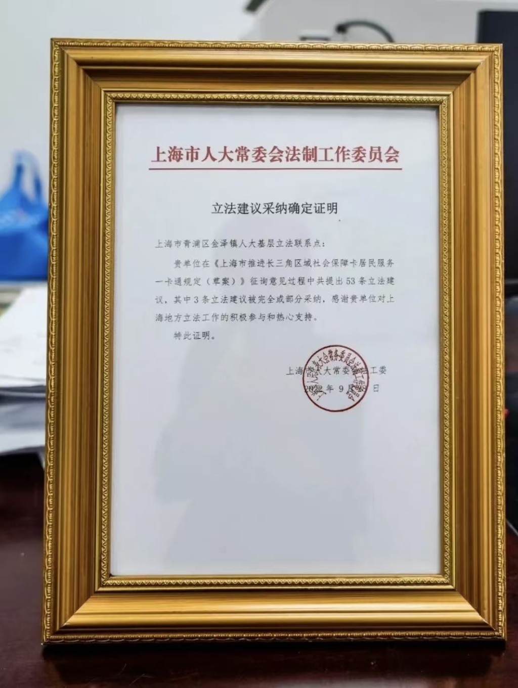 在《上海市推进长三角区域社会保障卡居民服务一卡通规定》征询意见过程中,金泽镇基层立法联系点召开了青嘉吴人大、长三角示范区执委会意见征询座谈会以及14家信息采集点意见征询座谈会,邀请战略协同区域各镇人大、各相关职能部门和部分人大代表等开展意见征询座谈,共提出53条立法建议,其中3条被最终采纳。