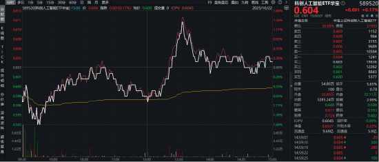 今日(10月22日)算力芯片股午后走强,领涨超4%,总市值重返6000亿元。、等个股涨逾2%,重点布局国产AI产业链的科创人工智能ETF(589520)午后快速冲高,场内涨幅更高上探1.33%,后涨幅略有缩窄,最终收涨0.17%,斩获日线2连阳。