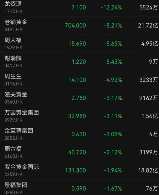 受国际贵金属价格跳水影响,贵金属板块普跌。灵宝黄金下跌4.75%,万国黄金和潼关黄金跌超3%,、招金矿业等跌超2%;珠宝首饰股同样承压,老铺黄金跌超8%,周大福、周生生、周六福等均出现下跌。