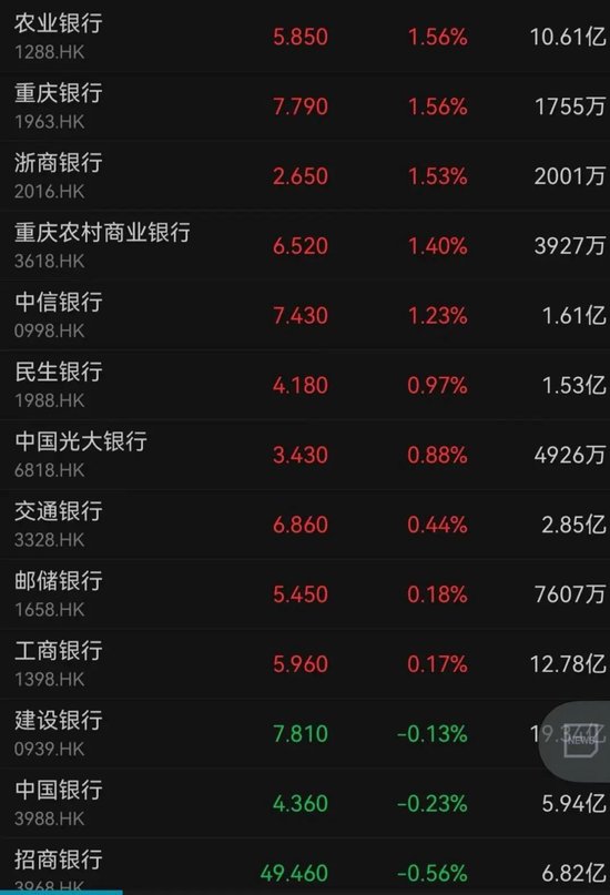 港股内银板块活跃,农业银行上涨1.56%,报收于5.85港元/股,创新高;、、和涨幅均超1%。