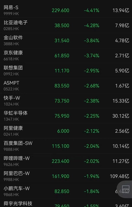 网易、电子跌超4%;快手、哔哩哔哩、百度集团均跌超2%;半导体板块,华虹半导体、舜宇光学科技分别下跌2.25%、1.55%。