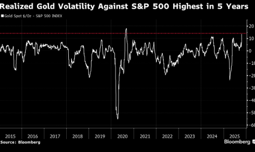 更令人忧虑的是贵金属价格开始显现波动性,这个以稳定避风港著称的市场正背离其传统属性。周二,黄金价格相对于标普500指数的已实现波动率升至2020年以来更高水平。