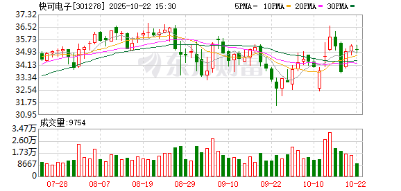 交易行情显示,10月22日,快可电子收跌0.57%,收于35.1元/股,总市值31.49亿元。