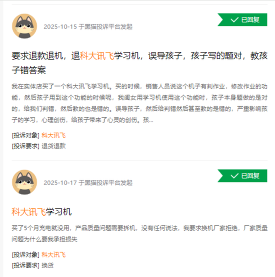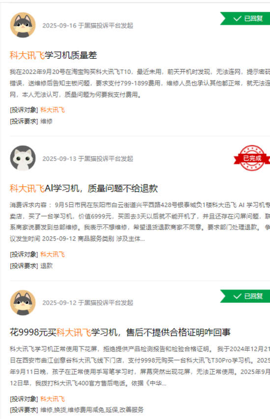 在黑猫投诉 平台上,科大讯飞学习机已成为投诉热点。