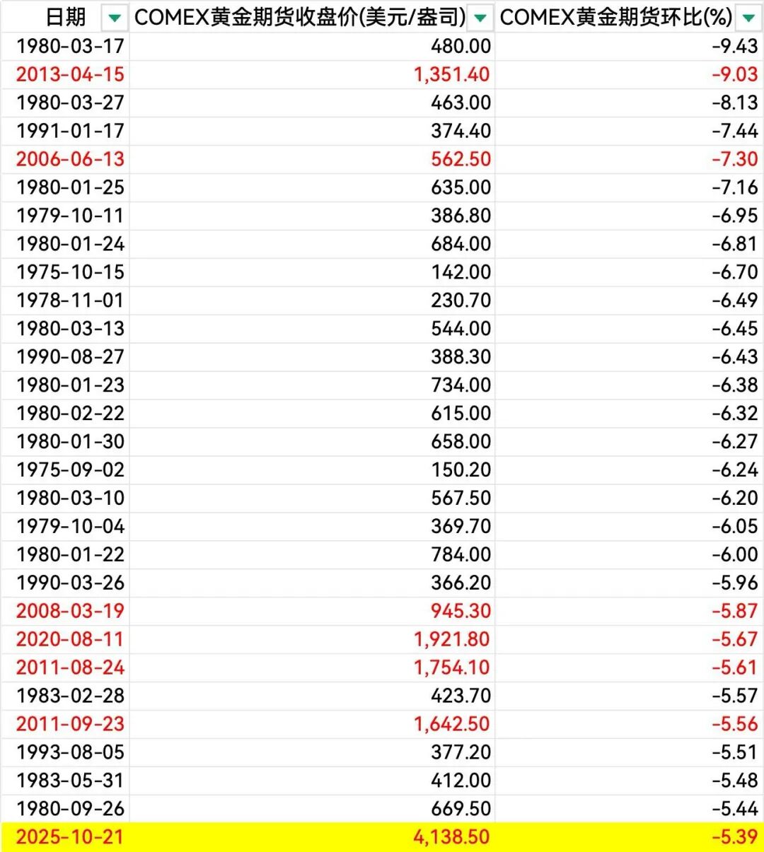 COMEX黄金价格出现单日大幅下跌的情况