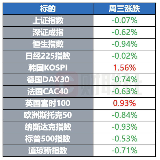 全球主要指数周三普遍下跌,美股三大指数集体收跌,纳指跌近1%。