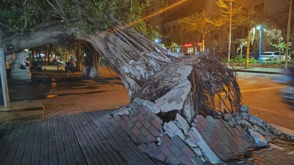 2024年9月,超强台风“摩羯”冲击,海口行道树连根拔起。图片来自 ***