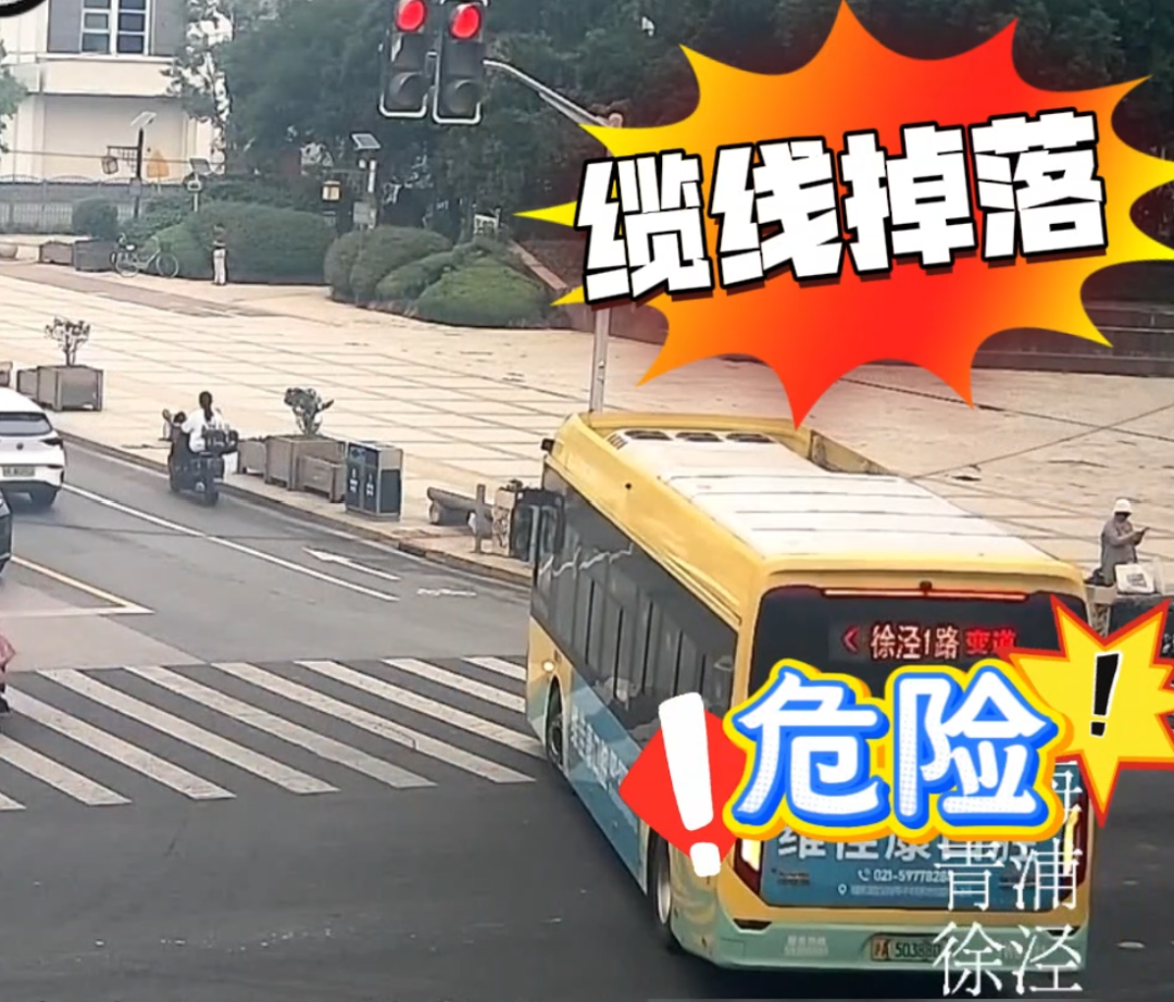 垂落的电线影响了公交车的通行。“警民直通车上海”微信公号 图