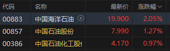 石油股涨幅居前,中国海洋石油涨超2%。机构分析称,在美国宣布对俄罗斯更大的石油生产商实施制裁后,周四盘初油价跳涨。在有迹象表明最近的抛售过度,以及美国原油库存下降有助于缓解供应过剩担忧的背景下,油价已从周一触及的五个月低点反弹。
