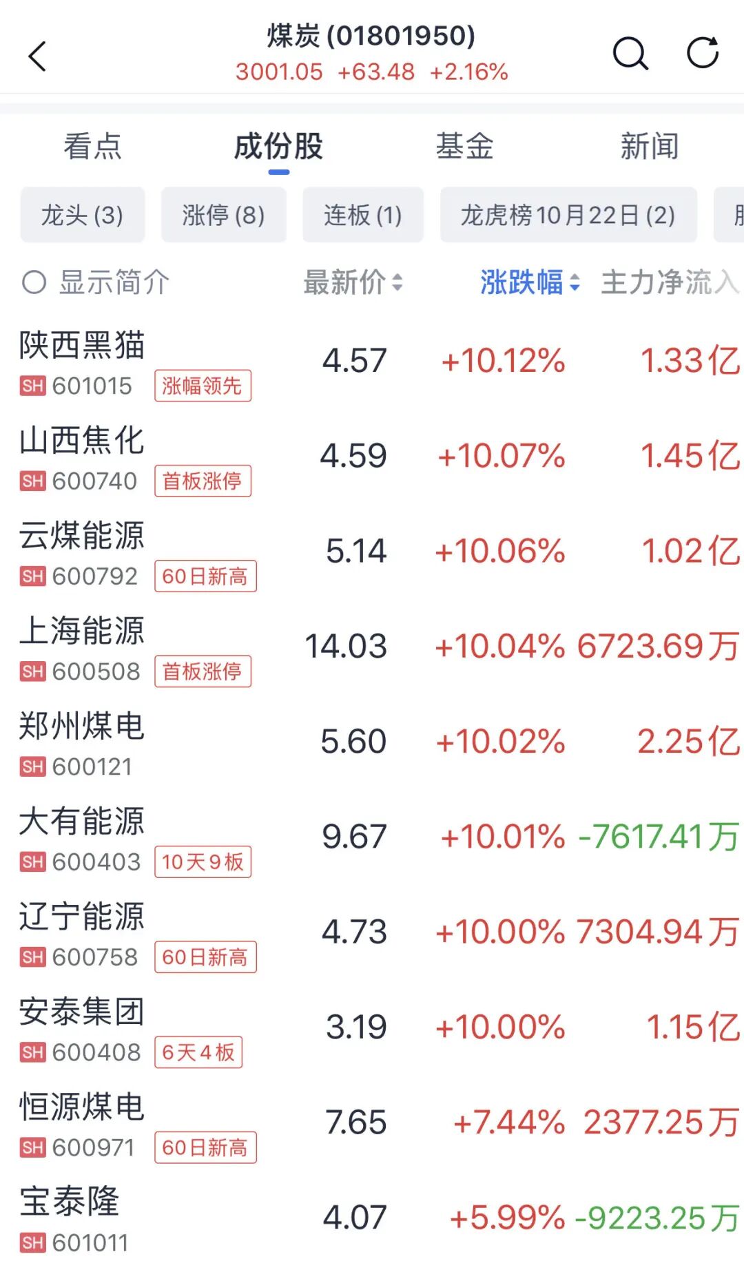 煤炭板块逆势走强,上午盘中更大涨幅超过2%。大有能源连续第8个交易日盘中涨停。陕西黑猫、、云煤能源、上海能源、郑州煤电等多股亦涨停。