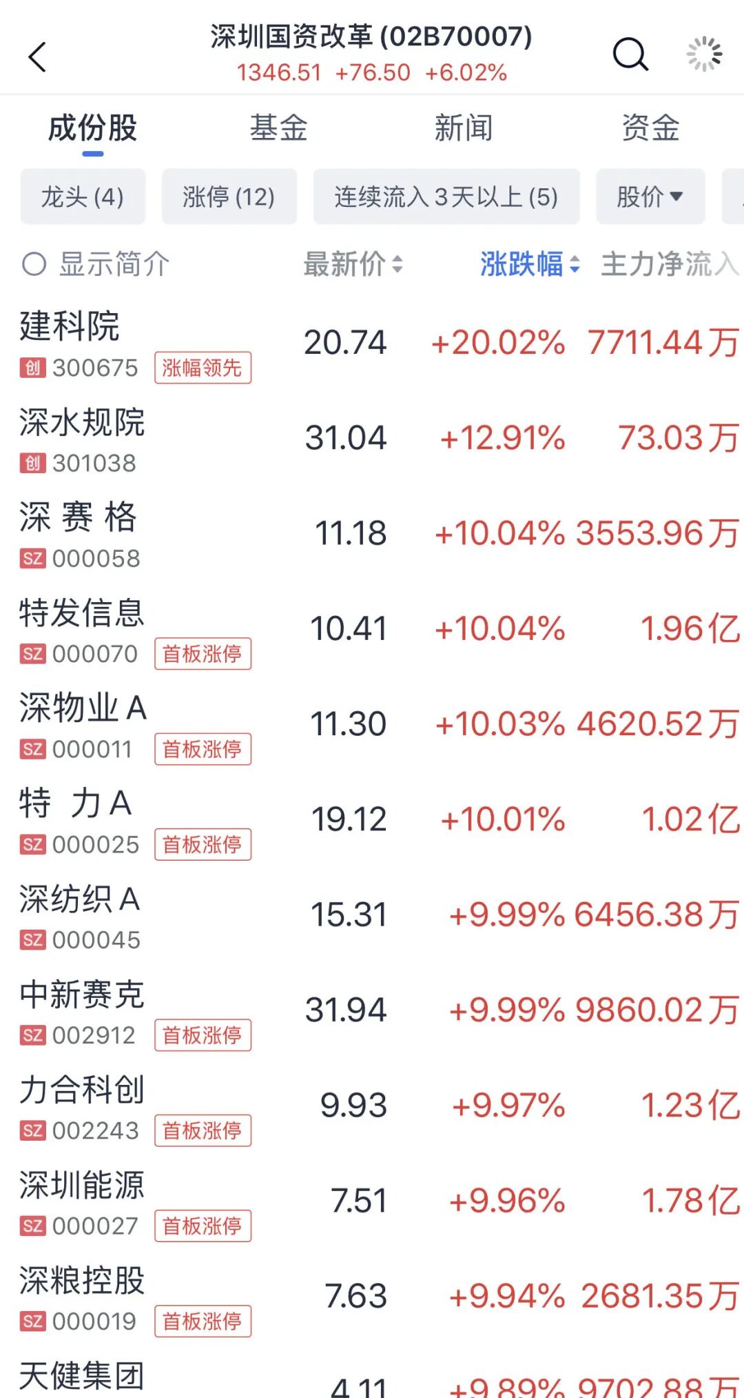深圳国资概念板块盘中集体大涨,建科院20%涨停,特发信息、深赛格、深纺织A、深圳能源、深粮控股、天健集团等多股亦涨停,还有多股跟涨。