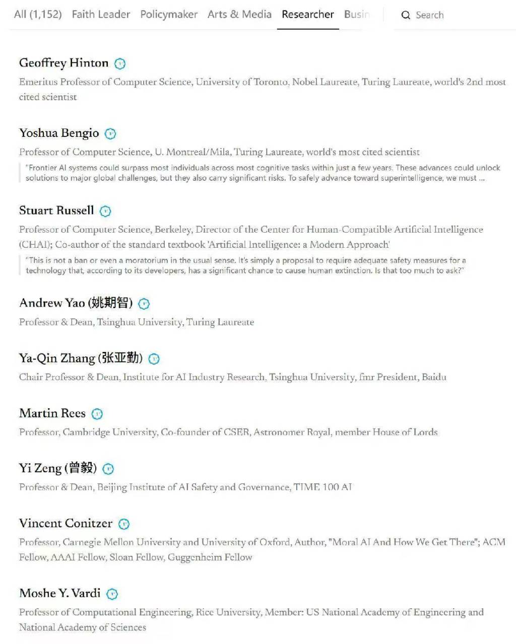 该声明由非营利组织未来生命研究所发起,包括人工智能先驱杰弗里·辛顿(Geoffrey Hinton)、苹果公司联合创始人史蒂夫·沃兹尼亚克(Steve Wozniak)、维珍集团董事长理查·布兰森(Richard Branson)、经济学家达龙·阿西莫格鲁(Daron Acemoglu)以及前美国国家安全顾问苏珊·赖斯(Susan Rice),都参与了签名。