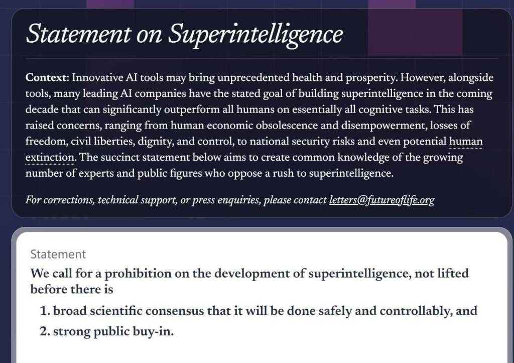 10月22日,中美两国人工智能领域的顶尖专家和技术领袖联名发起一项呼吁,在科学界达成“安全可控开发超级智能的广泛共识”前,应暂停“超级智能”的研发。