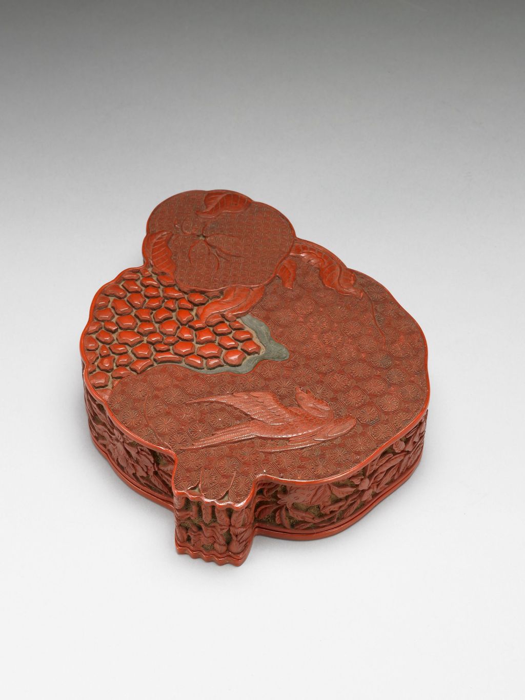 台北故宫博物收藏的清代剔红石榴式盒,器内作黑漆,器底髹红漆。以石榴为造型,上侧另加一个瓜形,衬以两三叶片,造型巧妙。侧面饰折枝石榴,兼具写实与装饰的美感。瓜形作双钱形锦地,石榴左侧开裂,边缘灰漆斜现,露出粒粒分明的果实,石榴作龟形花式锦地,下侧一燕回首,内容丰富。运用不同的锦地制造不同的质感,犹如精致的丝绸织品。