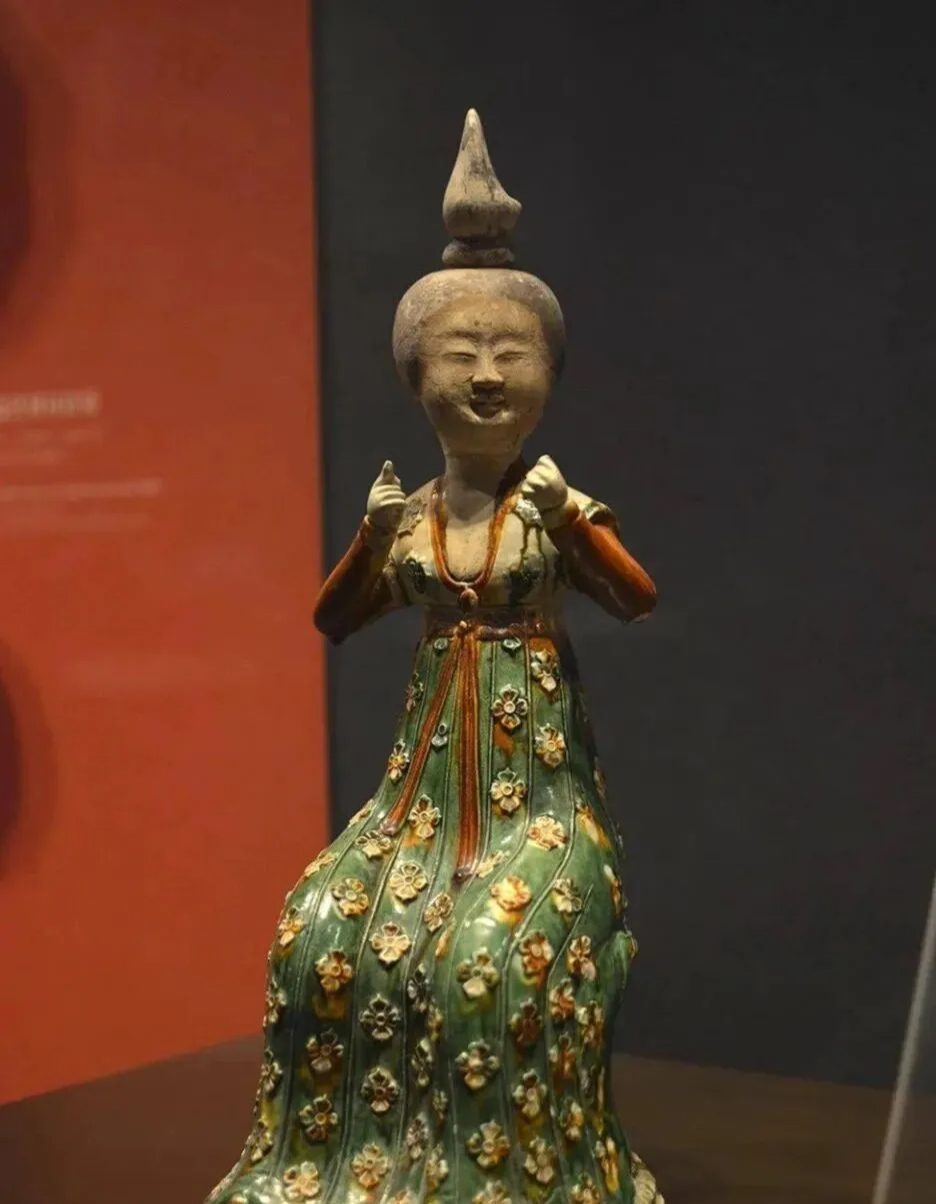 唐代三彩梳妆女坐佣长裙的柿蒂纹