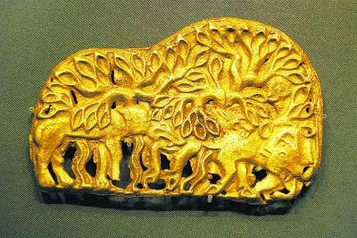 青海博物馆收藏的战国匈奴狼噬牛金牌饰为战国时期匈奴文化金器,以纯金铸造(质地:金),采用浮雕技法呈现山峦森林间狼噬牛的生动场景。