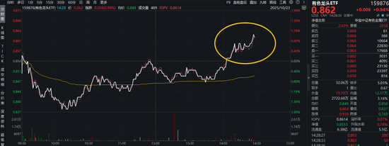 今日(10月23日)揽尽有色金属行业龙头的有色龙头ETF(159876)午后冲出水面以上,场内价格盘中拉升1%,现涨0.94%。成份股方面,涨停,获主力资金净流入超9亿元,荣登A股吸金榜第三,涨超4%,涨近4%,、等个股跟涨。