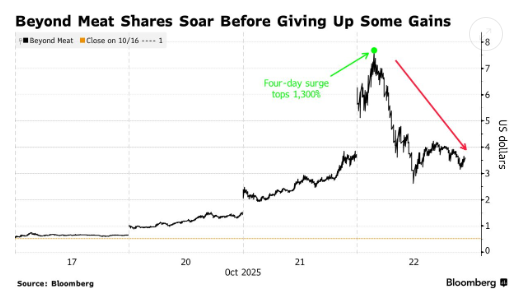 一场为期四天的暴涨,让尚未盈利的素食制造商Beyond Meat(BYND.US)股价飙升逾1000%,但大部分涨幅却在顷刻间蒸发殆尽;黄格创纪录飙升后,遭遇数年来最惨烈的两日抛售潮;与此同时,追踪比特币、Solana等波动加密货币的高风险ETF,却吸引了数十亿美元资金涌入。
