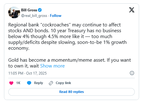 “黄金已变成一种动量资产、Meme资产,”太平洋投资管理公司(PIMCO)联合创始人比尔・格罗斯10月17日在X平台上发文称,当时金价一度飙升至每盎司近4380美元,“如果想入手,不妨再等等”。到周三下午,他的判断得到印证:金价已跌至每盎司约4004美元。