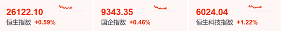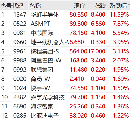 港股市场上午同步飘红,截至午间收盘,恒生指数涨0.59%,恒生科技指数涨1.22%,恒生国企指数涨0.46%;华虹半导体涨近12%,领涨恒生科技指数成份股。