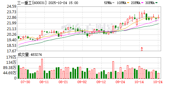交易行情显示,截至10月24日收盘,三一重工A股股价收涨1.01%,报22.91元/股,总市值1941亿元。